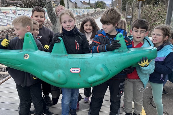 Am 13.03.2026 fand der diesjährige Dreck-Weg-Tag statt. Auch in diesem Jahr starteten die Kinder mit großem Eifer, Arbeitshandschuhen und Müllsäcken Richtung Gaulsheimer Bahnhof. Zunächst wurden hauptsächlich die üblichen Hinterlassenschaften, wie Flaschen, E-Zigaretten und Mülltüten gefunden. Am Bahnhof zogen die Kinder dann aber auch Teller, Bestecke, Eimer, Metallstangen und Zaunreste aus den Büschen. Der beste Fund war jedoch ein riesiges Schaukel-Krokodil, das nun als Pausenspielgerät in die Schule gebracht wurde.